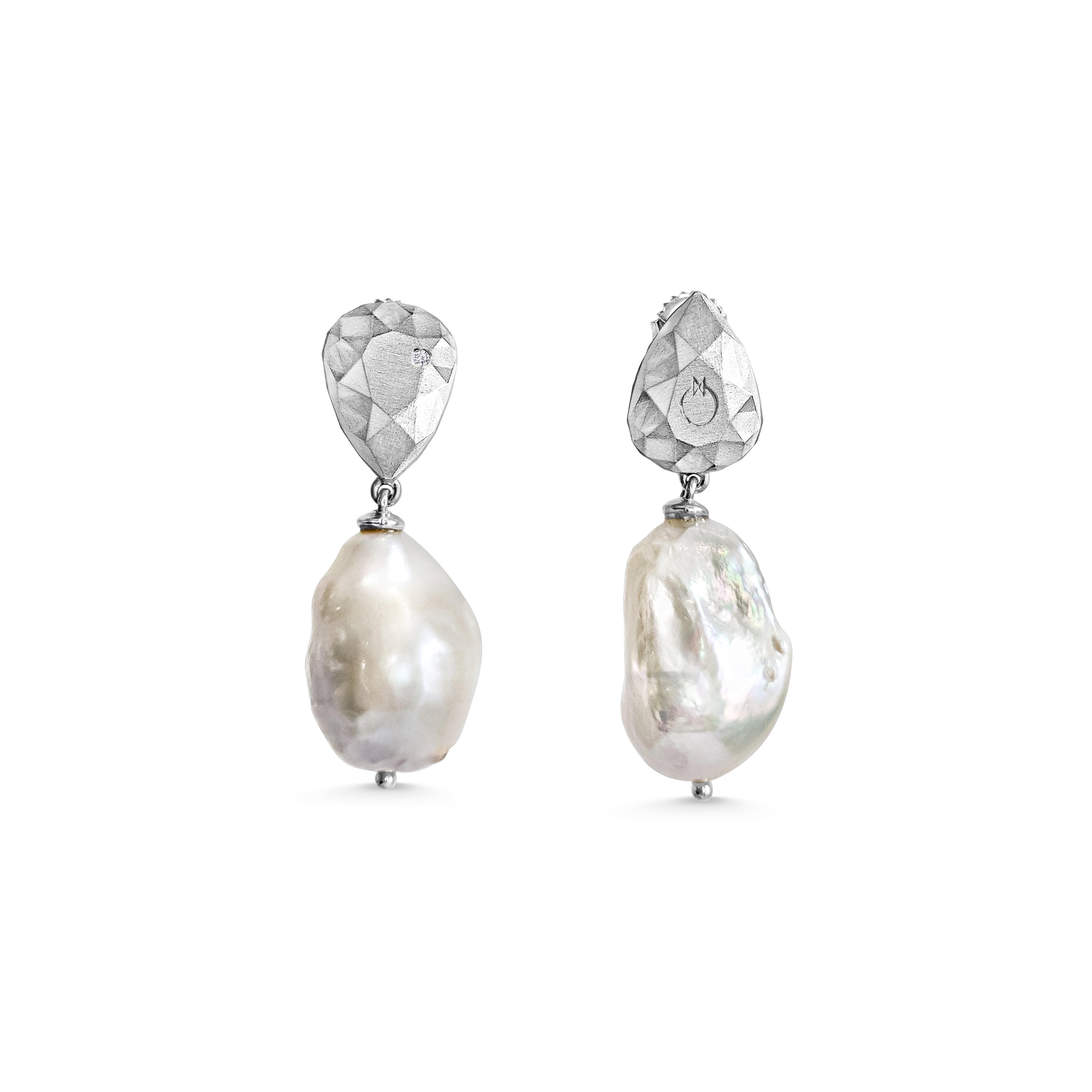 A focal piece in the Chromo-fine, Pepita series, Matilde’s Pepita Pearl earrings are a study in the beauty of irregularity and discreet details. They’re handmade from recycled 14ct gold or silver with Pepita studs – the collection’s take on nuggets as a representation of seeking out joy in the everyday – featuring a round brilliant-cut diamond, then finished with lustrous and bulbous baroque pearls drops.
