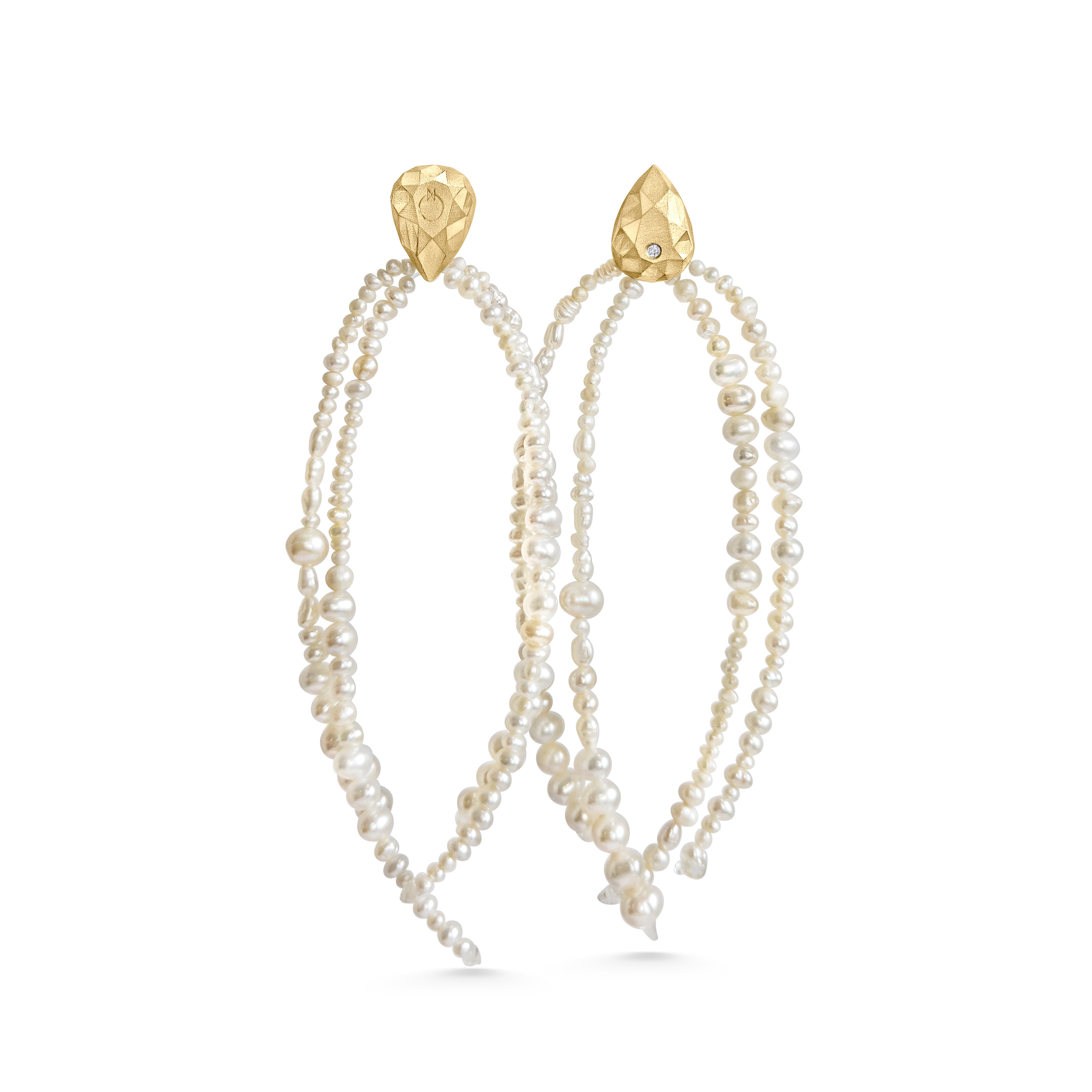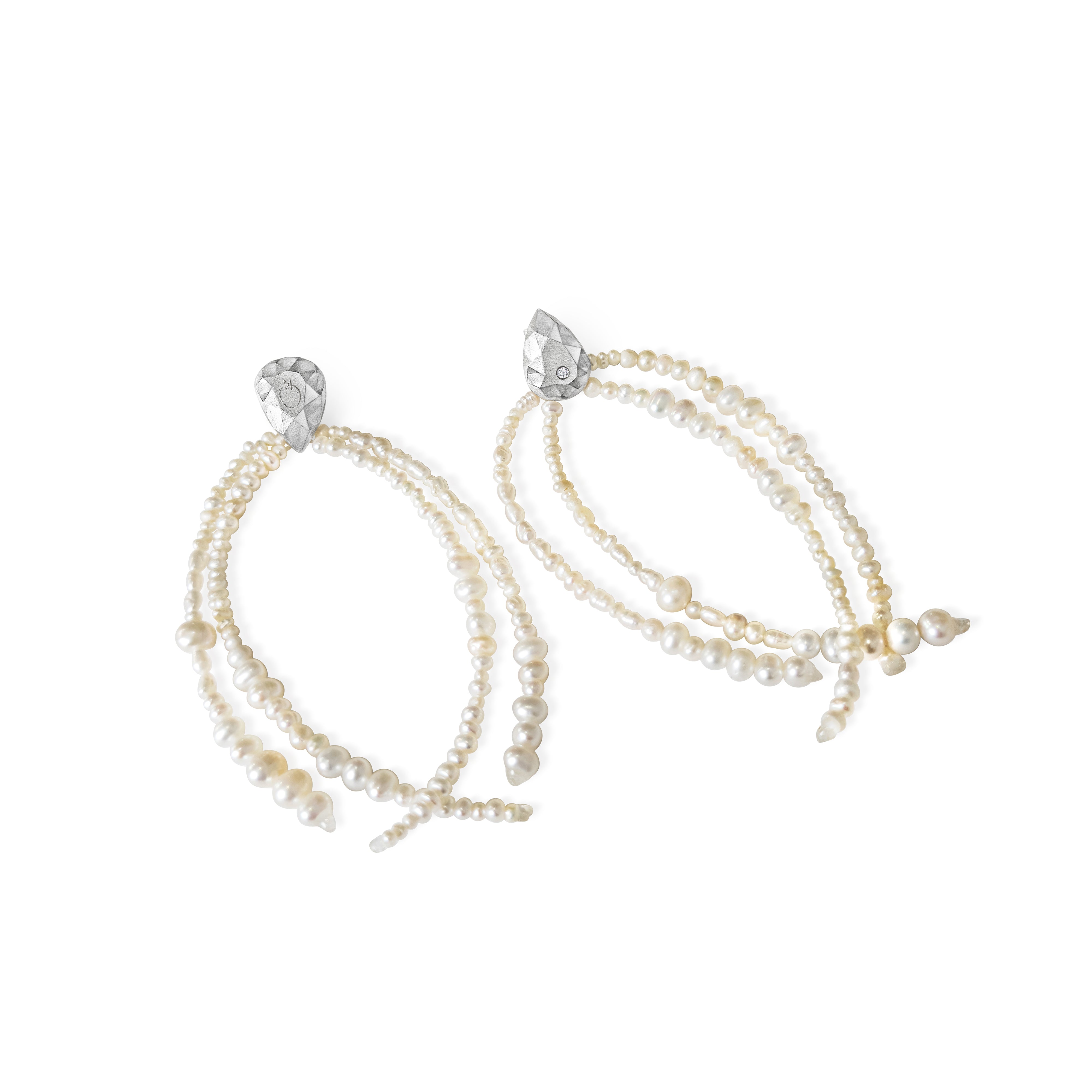 Matilde combines the sentiment-driven aesthetic of her jewellery design with the romance and grace of baroque pearls to create these Pepita pearl strand earrings. They’re beautifully handcrafted with quadruple strands of lustrous baroque and seed pearls, all of which artfully cascade from a signature Pepita nugget stud. The earring comprises a 14ct gold or silver stud earring, shaped with cast faceted and set with a round brilliant-cut diamond, then finished with a post-back fastening.