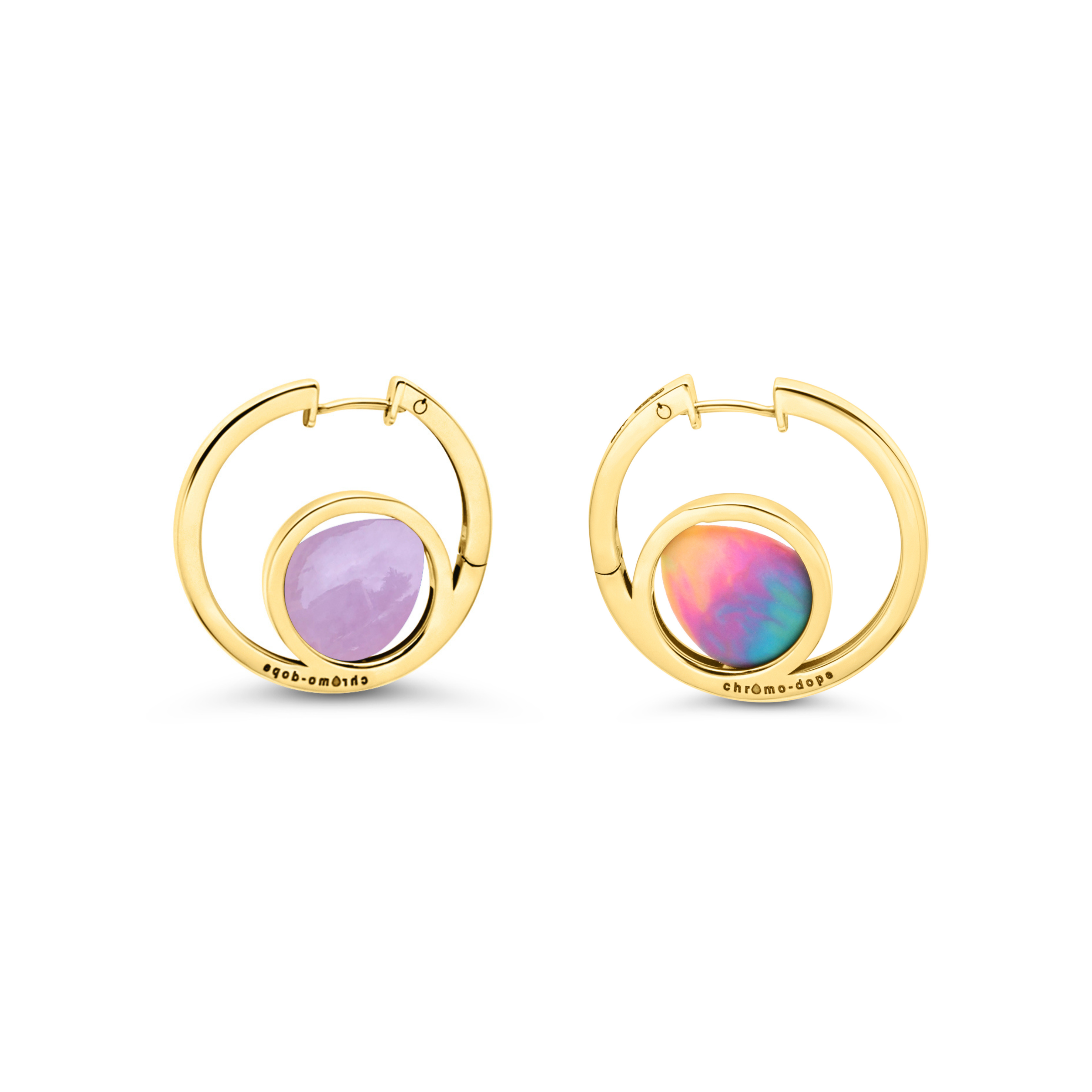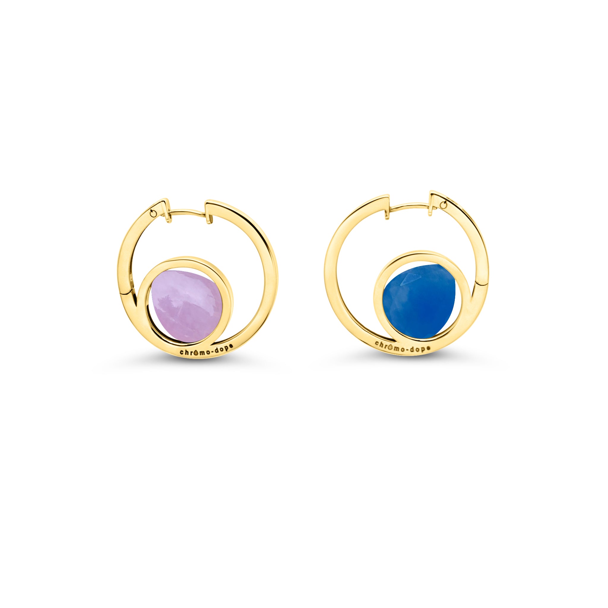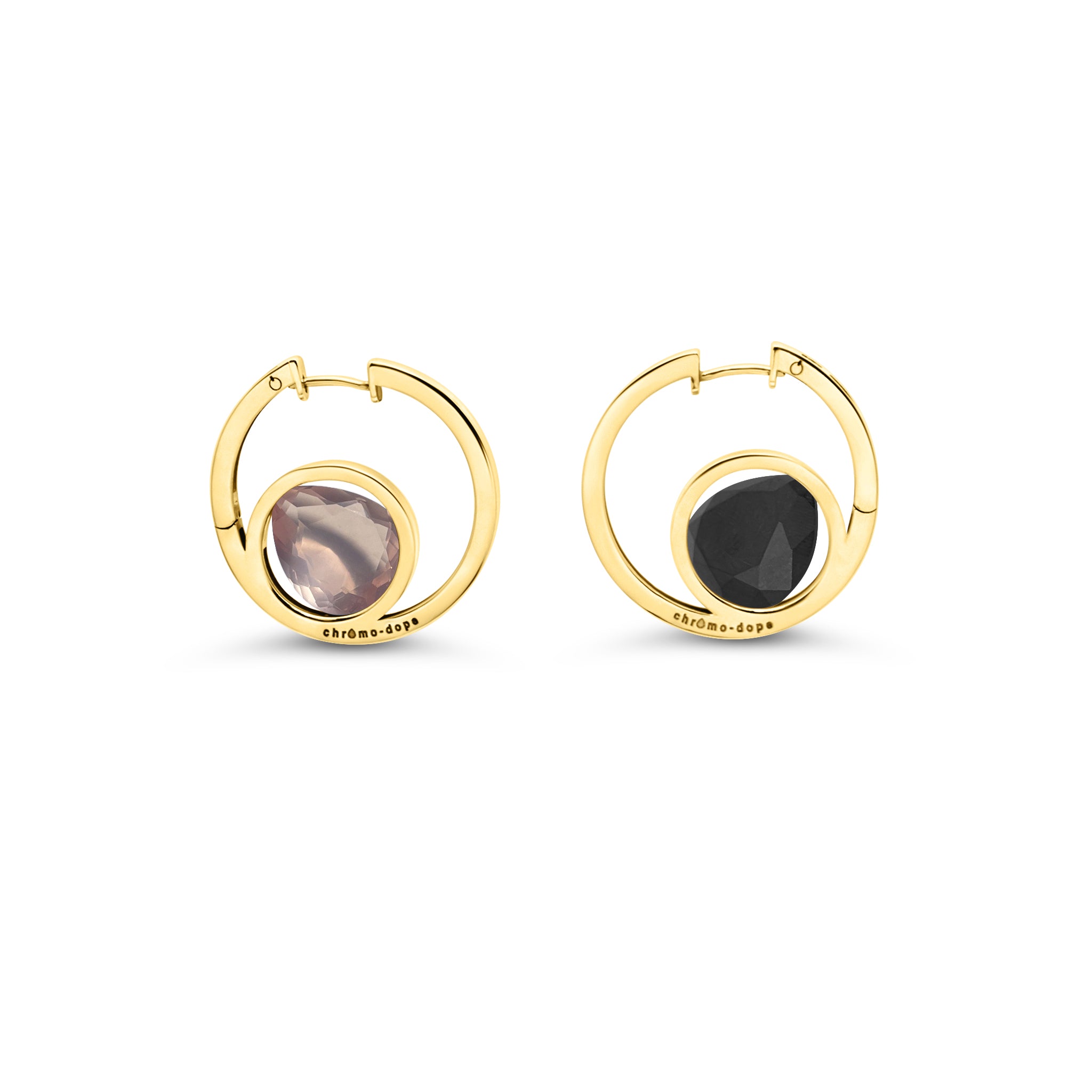 The interchangeable nature of these 9ct earrings are in keeping with Matilde’s core design philosophy – the stones centred in the earring’s looped shape can be switched out for one of five stone choices, depending on mood, occasion or personal instinct. Part of the Chromo-dope collection, they’re made from 9ct gold – also available in 9ct rose and white gold – with an elegant, three-dimensional circulate frame, and secure with a hinge fastening.