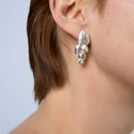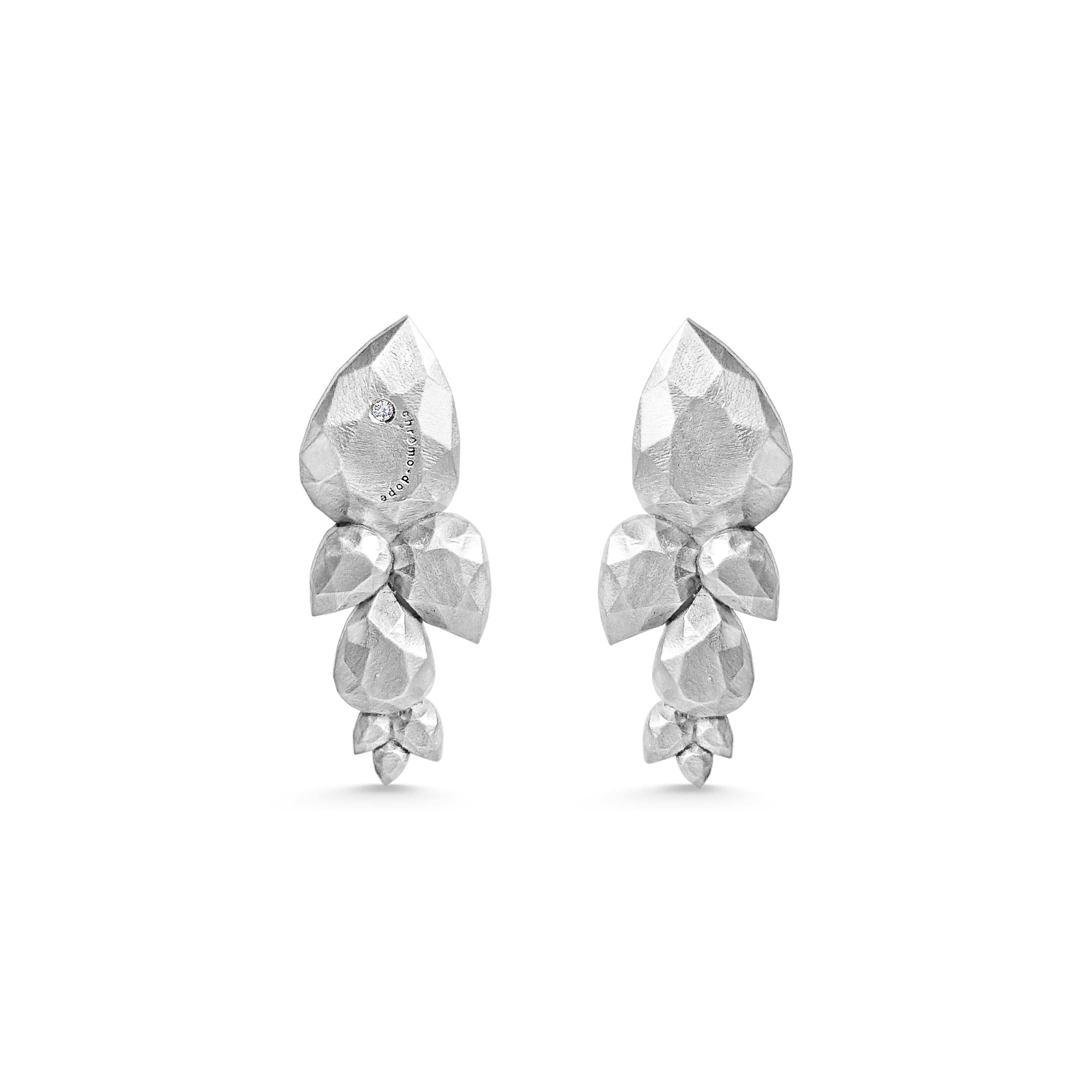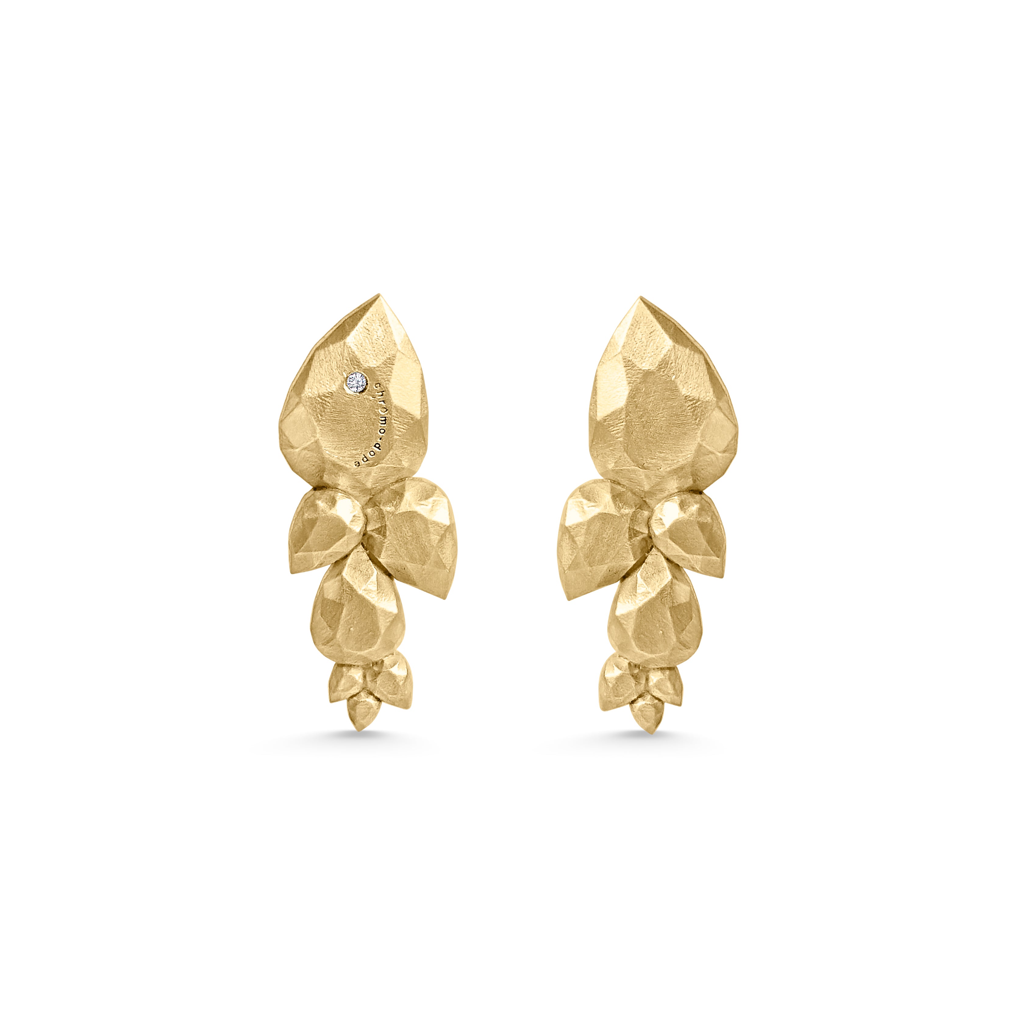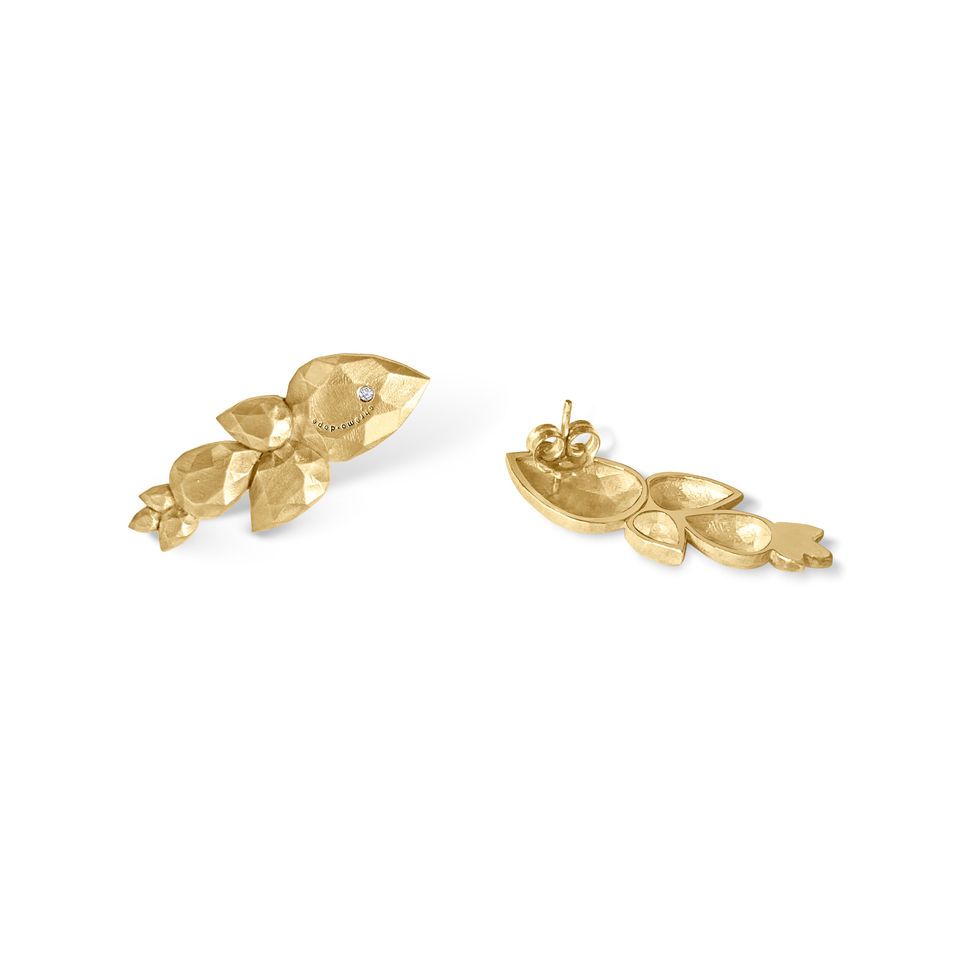 These whimsical recycled 9ct gold earrings are part of the Pepita series, designed to resemble nuggets of gold to be worn and loved as a comical play on precious metals – two leading sentiments in Matilde’s work in designing jewellery as wellness talismans. They’re crafted from recycled 9ct gold or silver featuring seven little nuggets studded with a brilliant cut diamond and finished with post back and butterfly fastening.