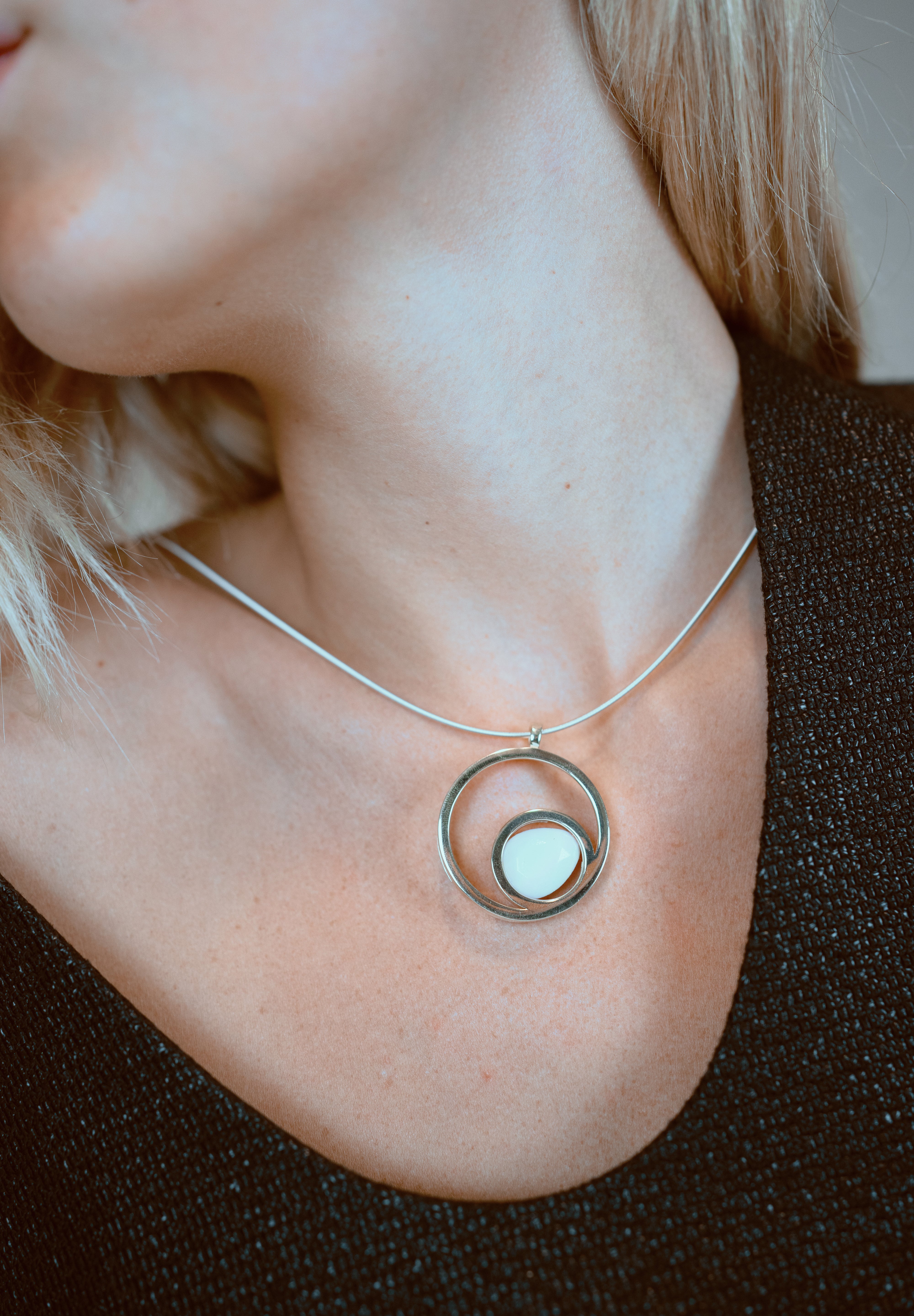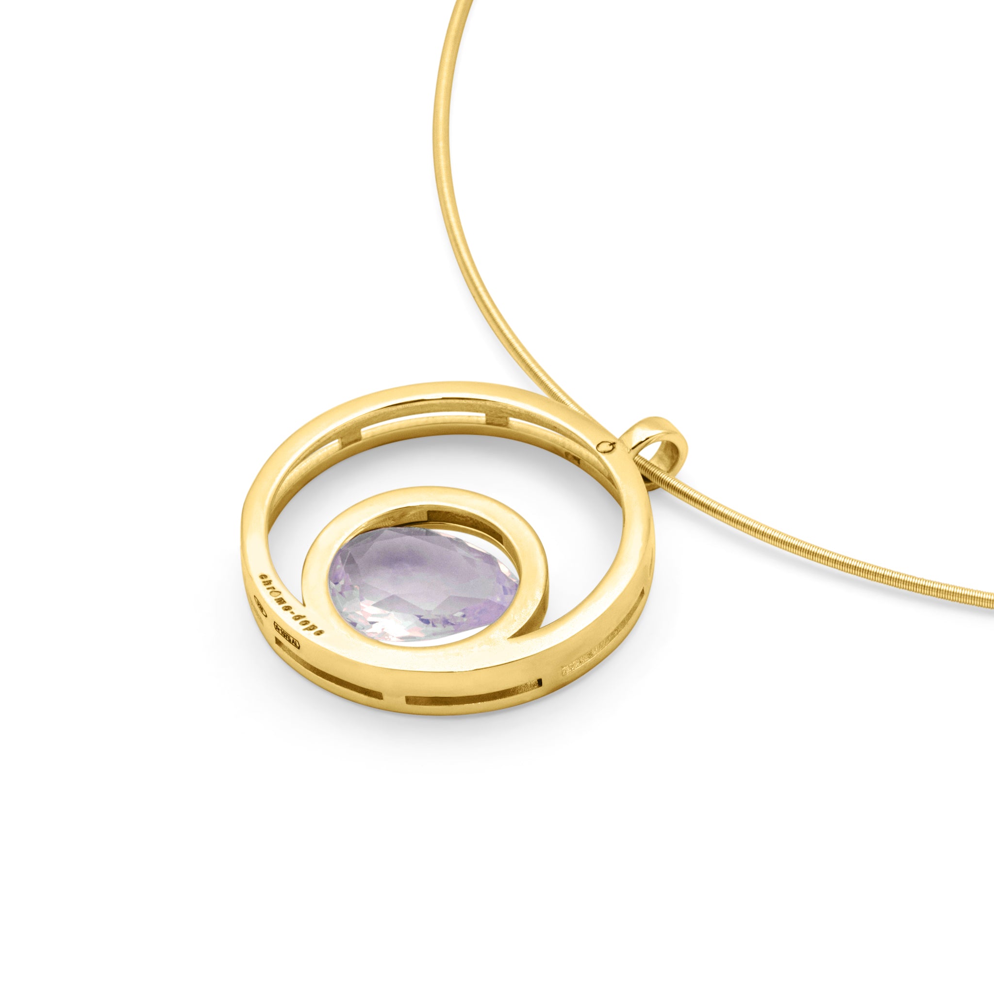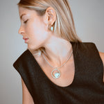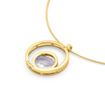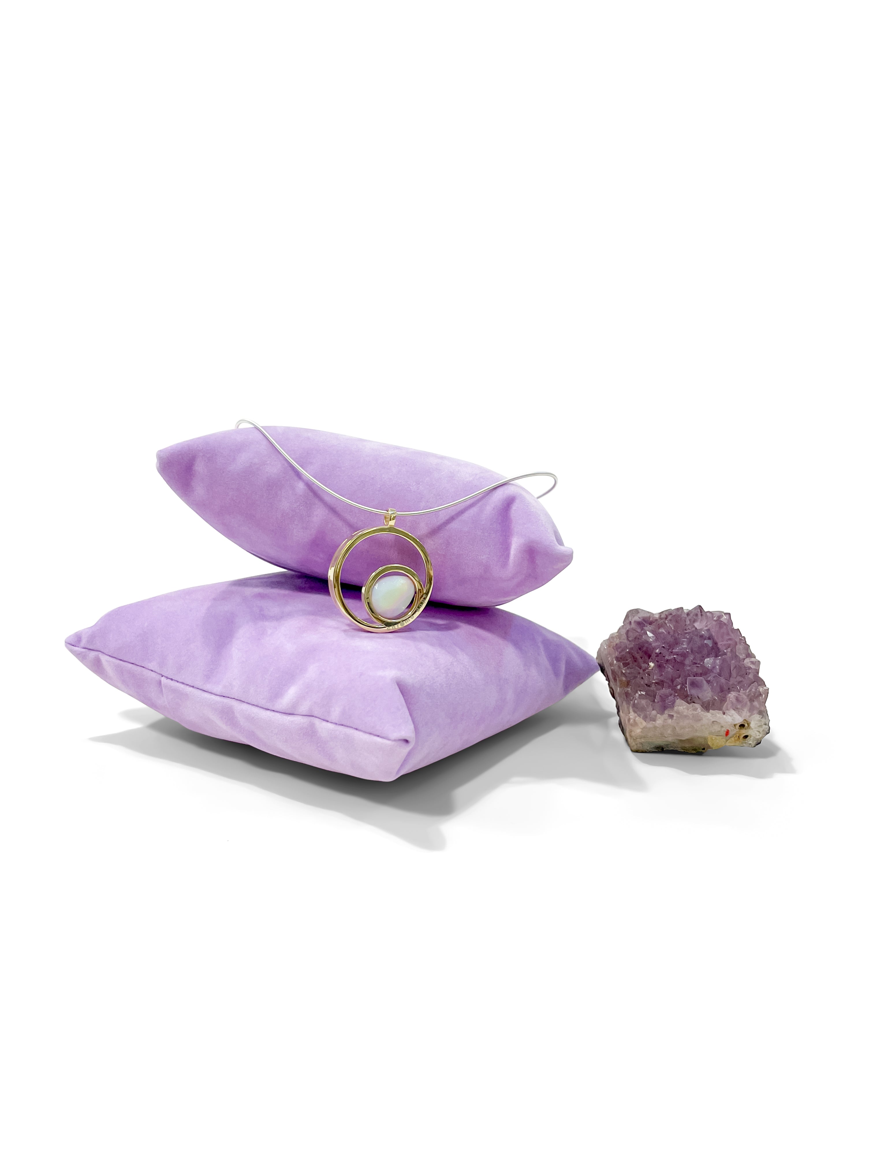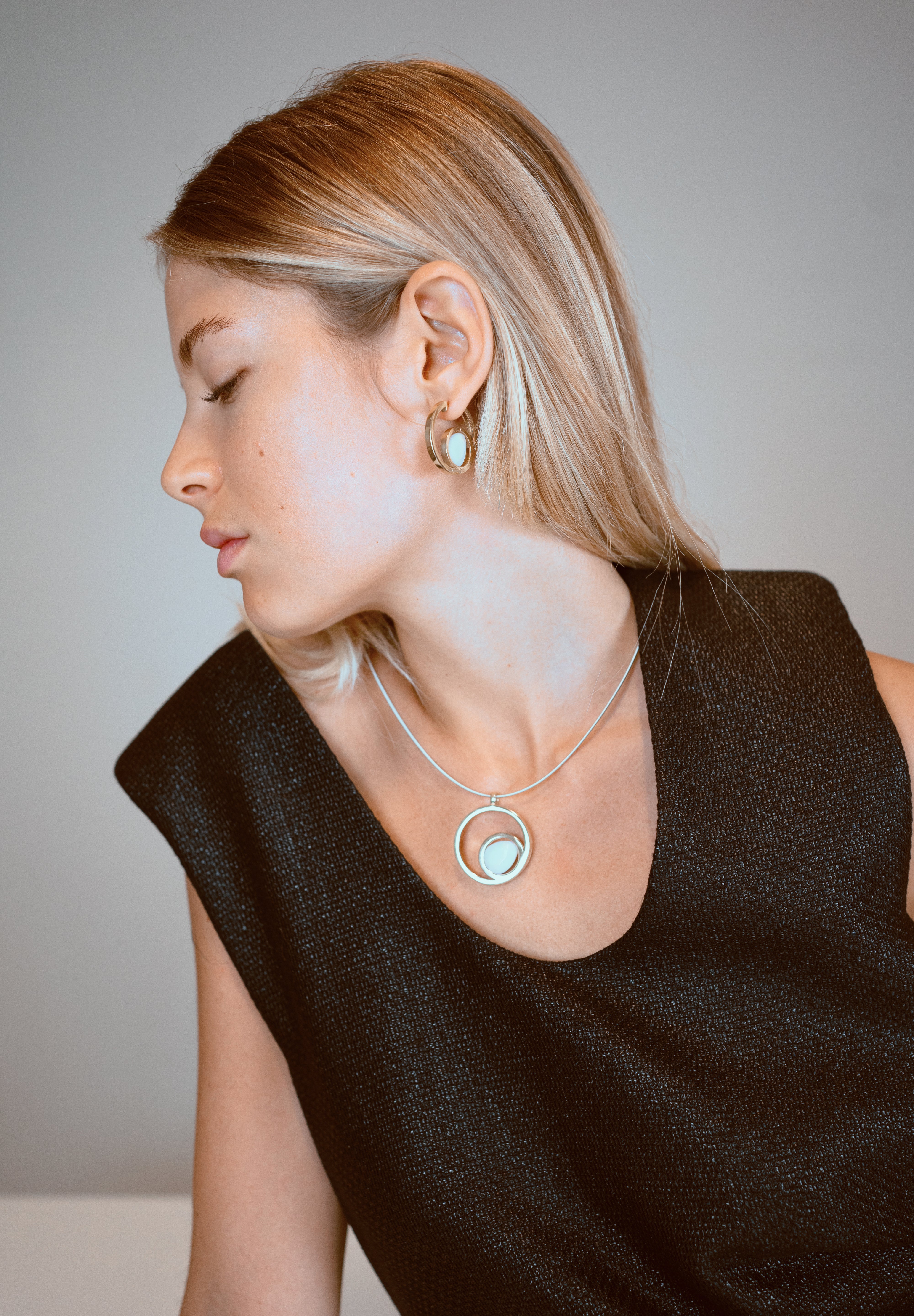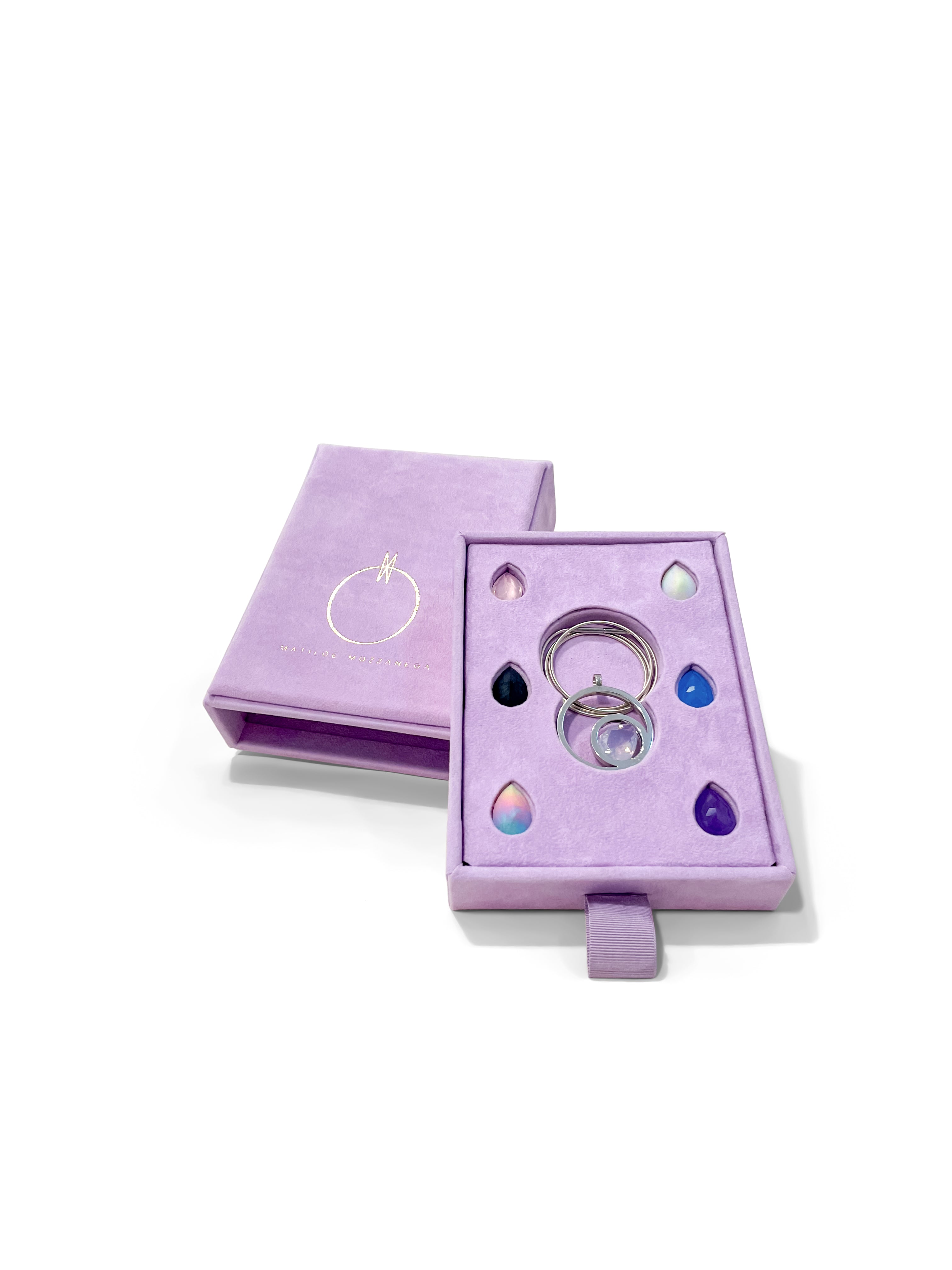 The Interchangeable pendant is a leading piece in Matilde’s Chromo- dope collection, defined by clean lines and elegant curvature, designed to be worn everyday as a personal wellness talisman. It’s handcrafted from 9ct gold with a three-dimensional pendant set with Matilde’s patented interchangeable mechanism, allowing the central stone to be swapped in and out, depending on mood, occasion, or intuition. Choose from drops of lilac jade, blue jade, rose quartz, onyx, 3-D printed recycled TPU crystal in the accompanying ‘blister packet’ for complete customisation.