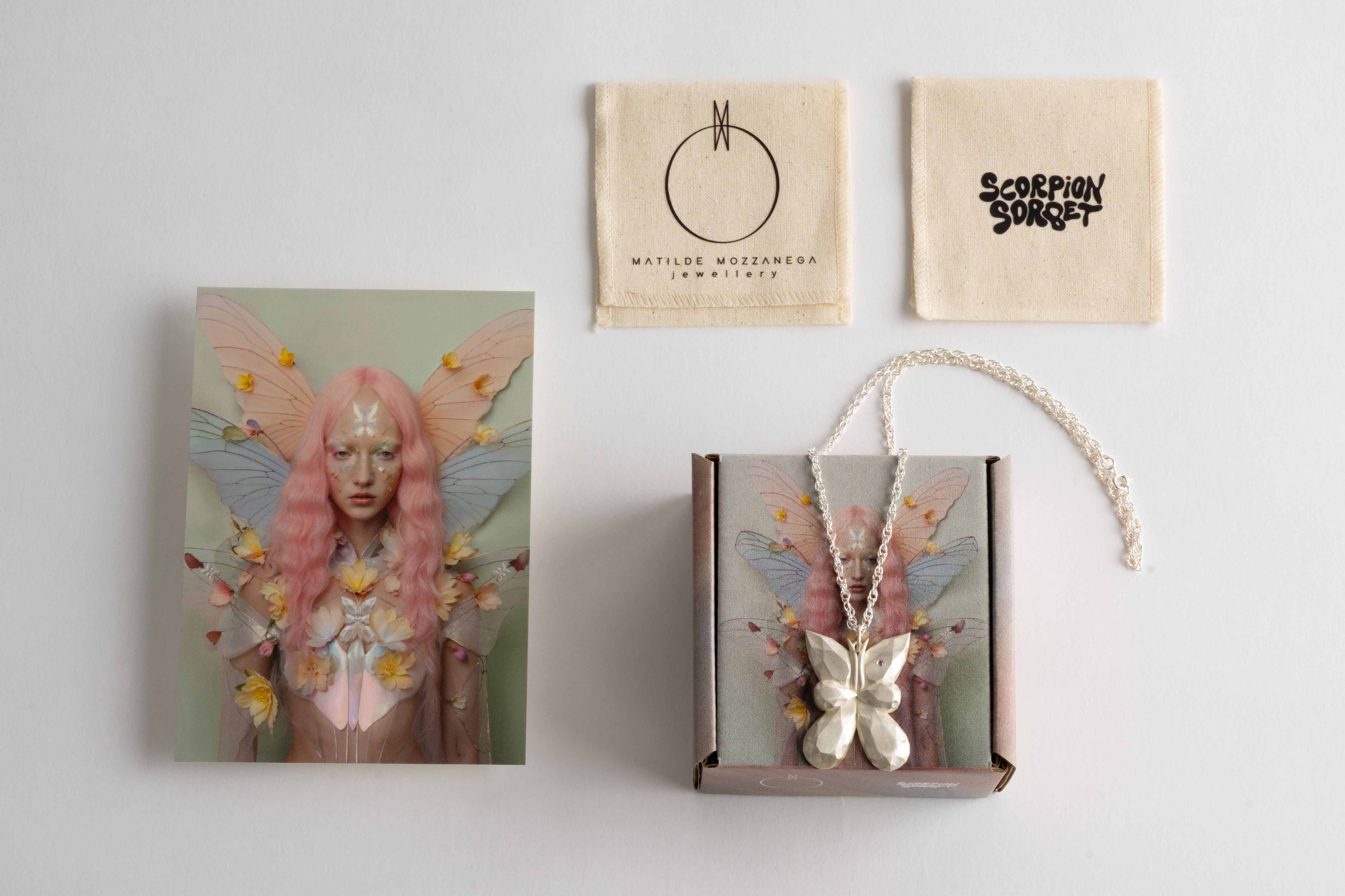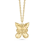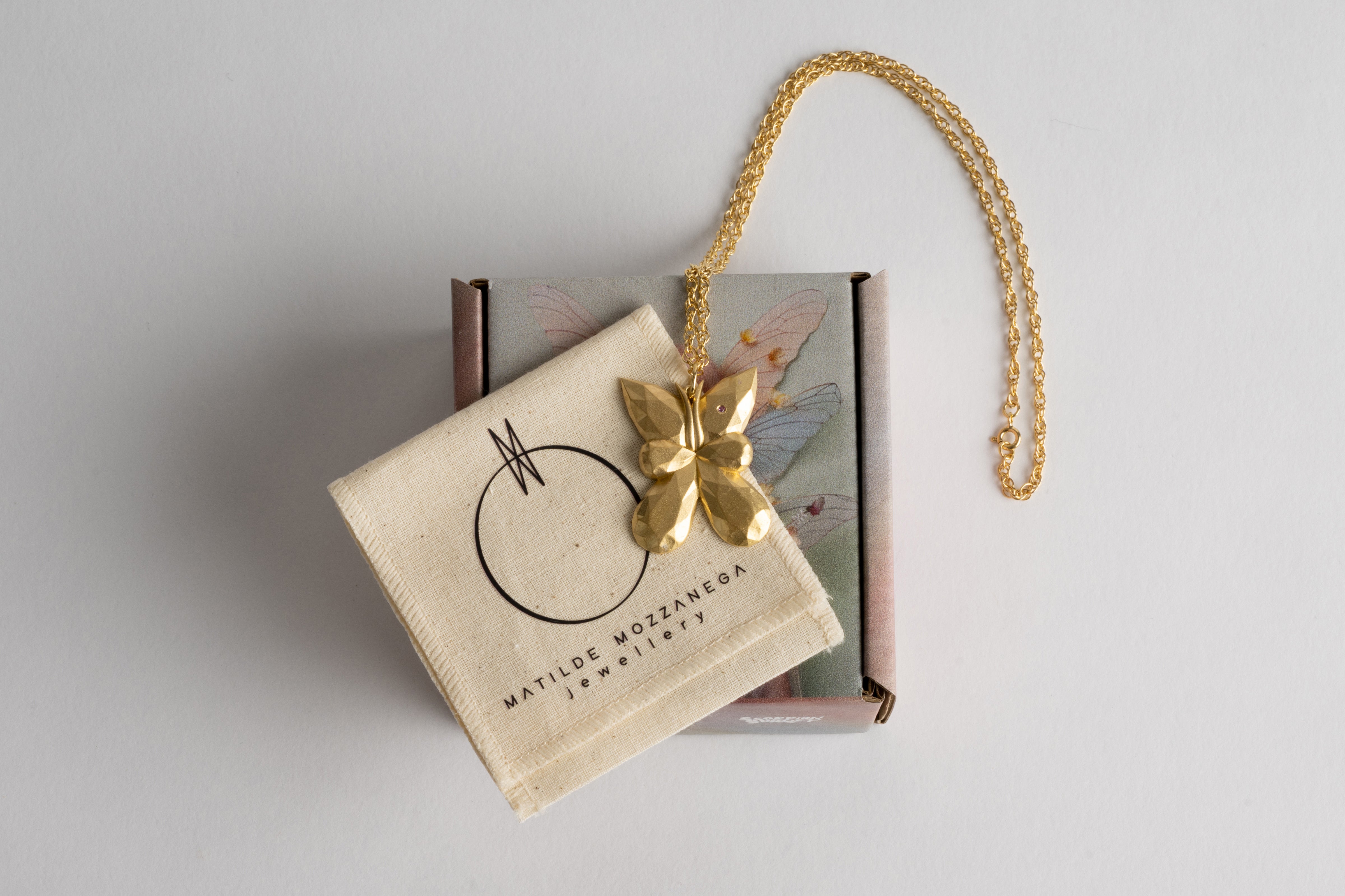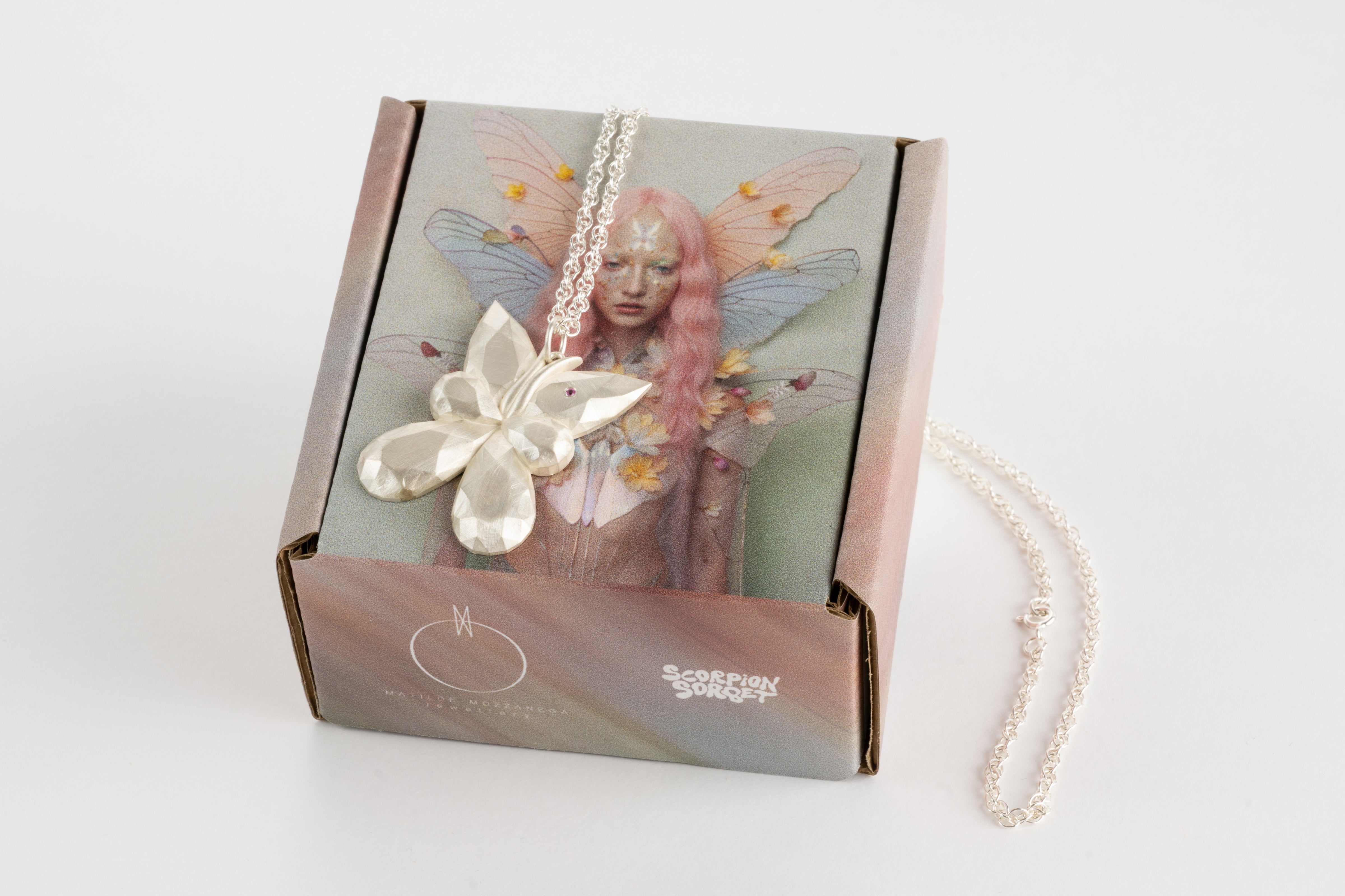 Our butterfly pendant glows with pink sapphire accents and is available in recycled silver or gold vermeil, evoking the tender moment a caterpillar becomes something else entirely. It is a reminder that transformation is sacred—and sometimes, quiet.
