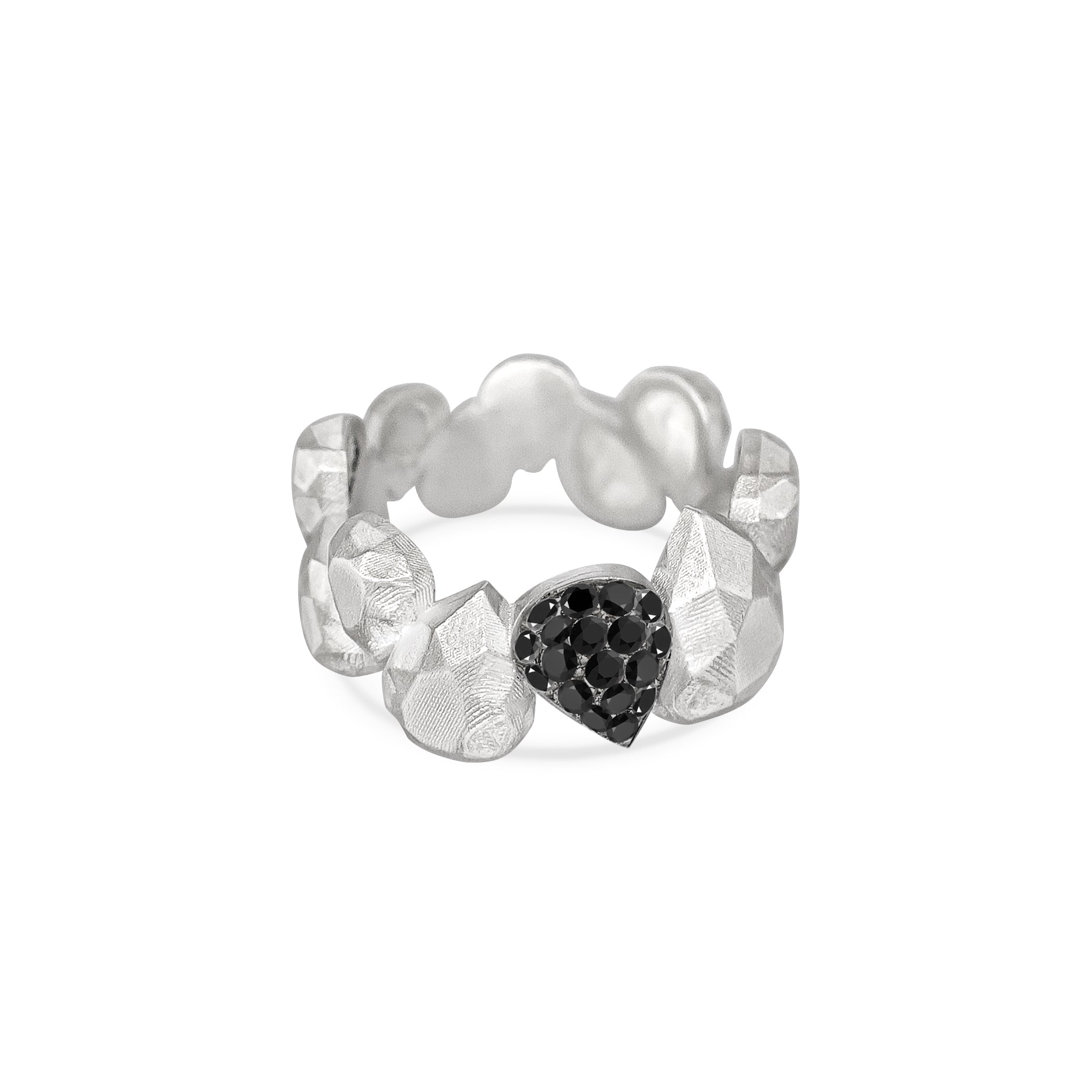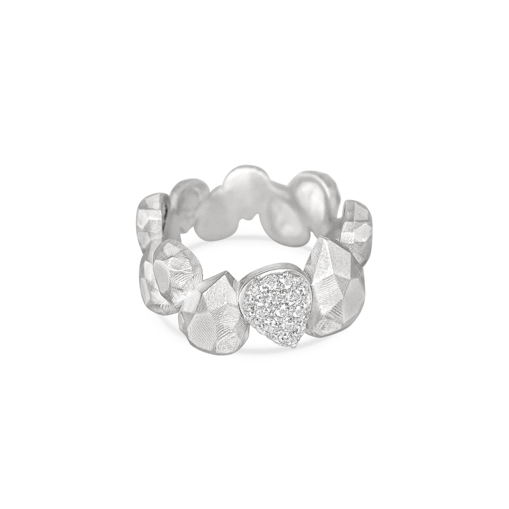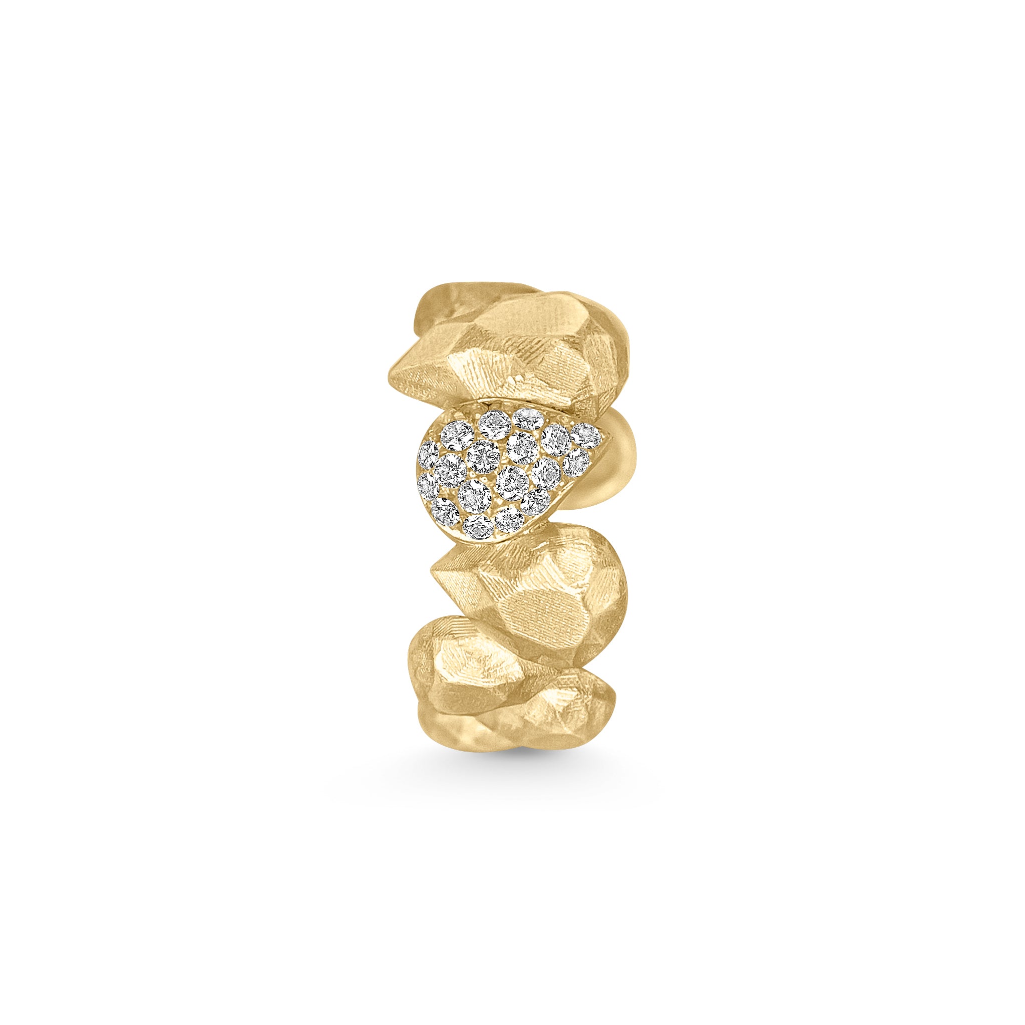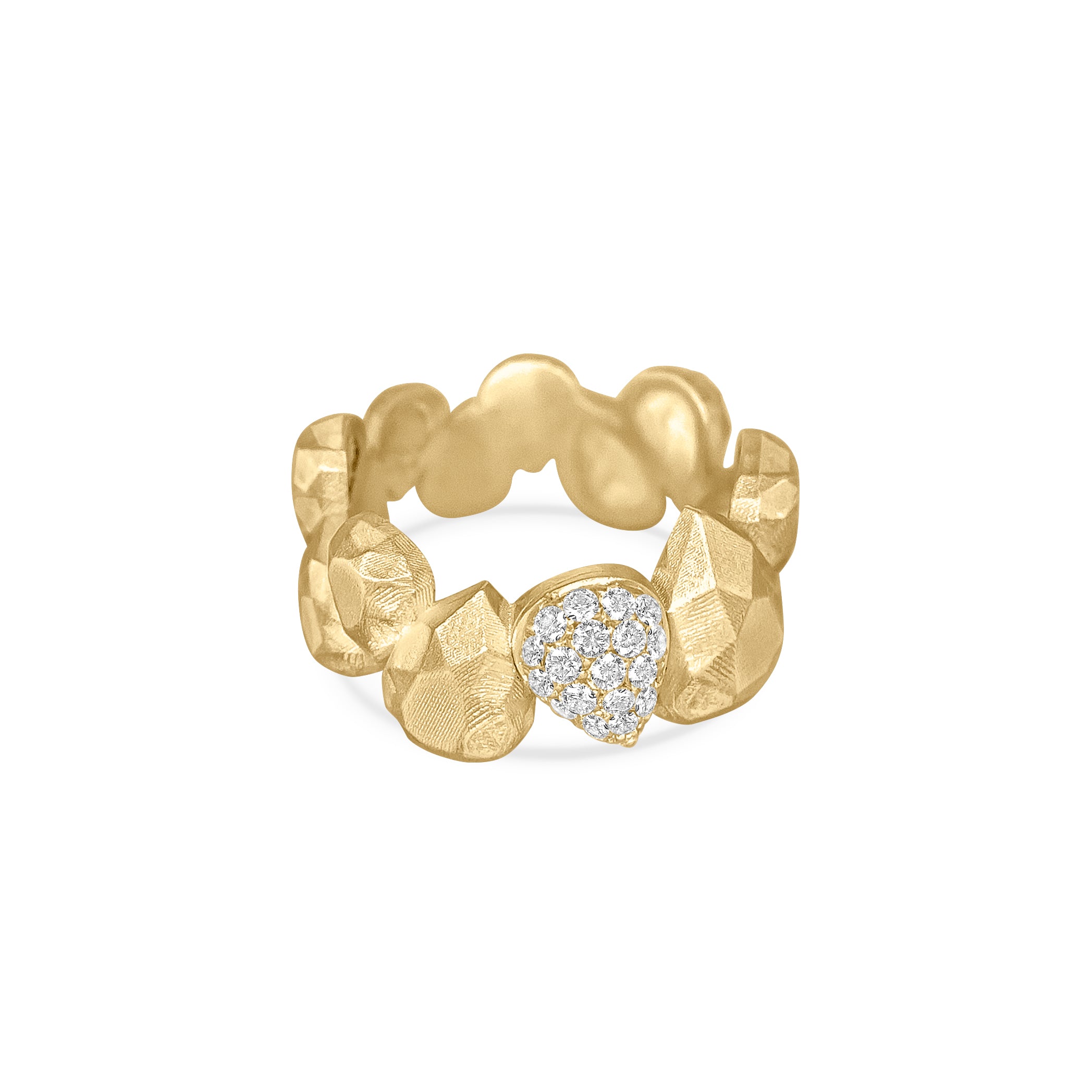 The Pepita Cluster ring is a core piece in Matilde’s Chromo-Fine collection; a charming ‘nugget’ themed piece of jewellery that can be worn as a reminder to seek joy and authenticity in the everyday. Comprised of Matilde’s signature namesake nuggets, it is crafted in warm 14kt gold or recycled silver to create a charming irregular band, then set with a collection of round brilliant-cut white or black diamonds. The ring is also available with a single, brilliant flush-set diamond as an alternative to the full pavé design.