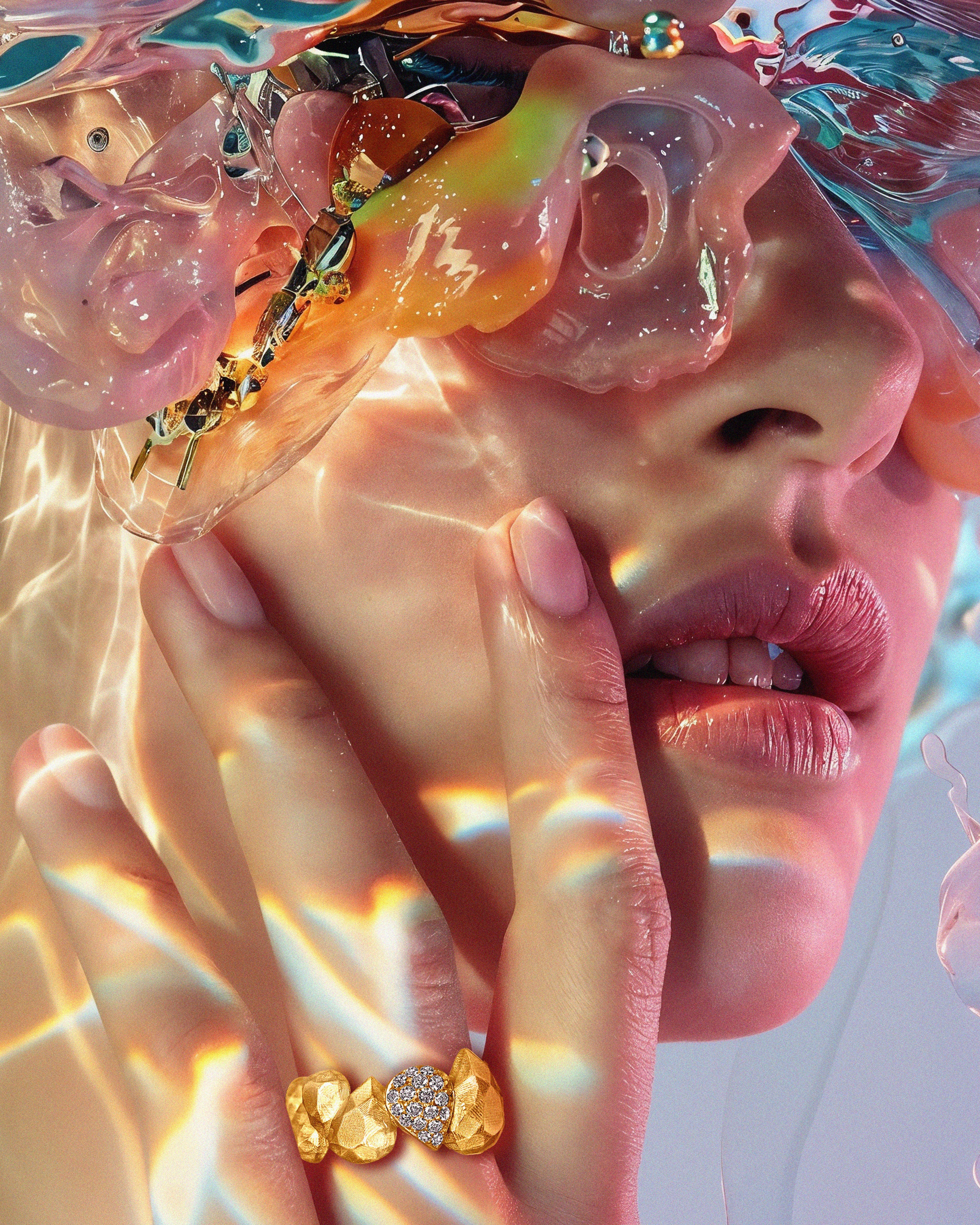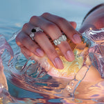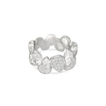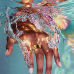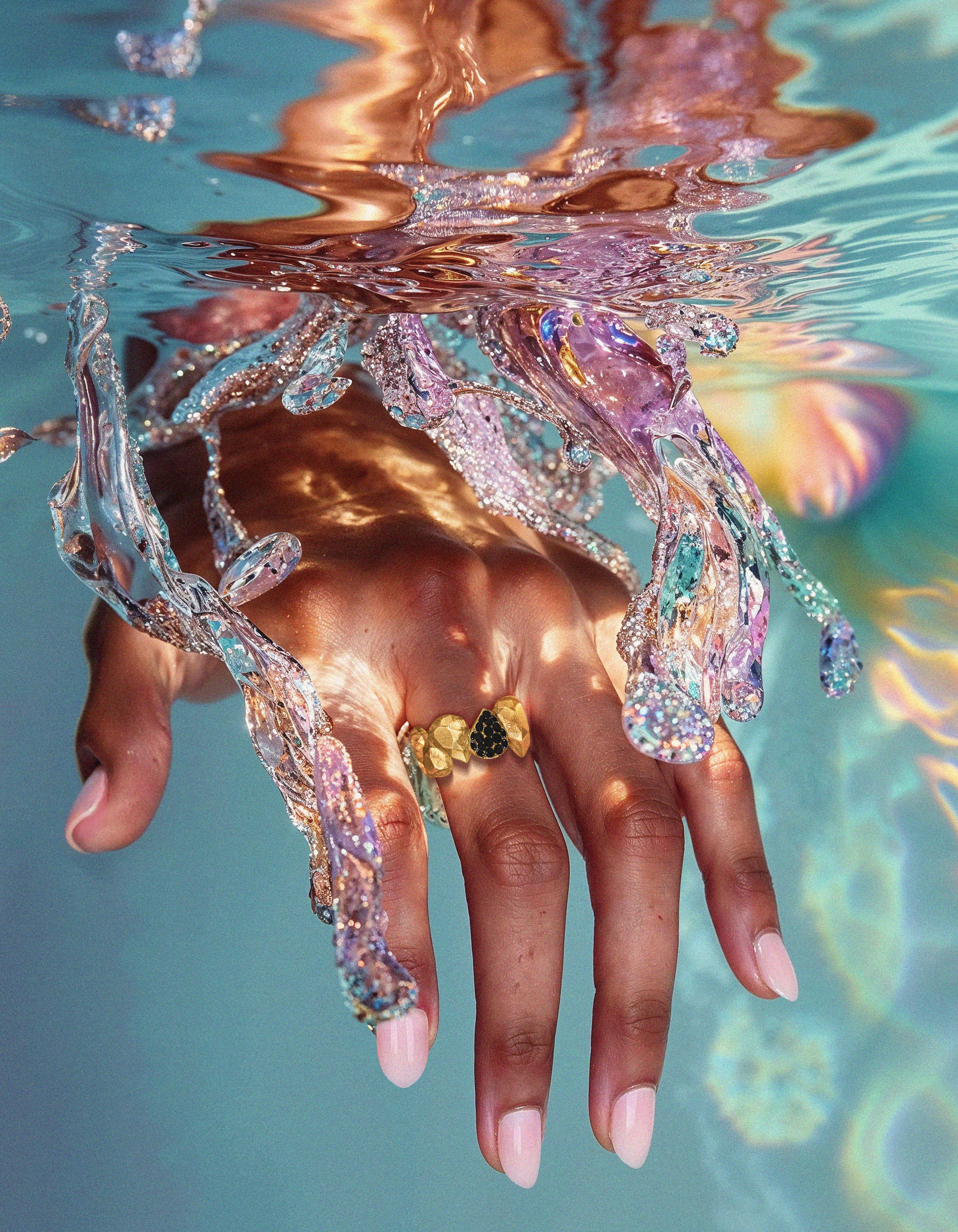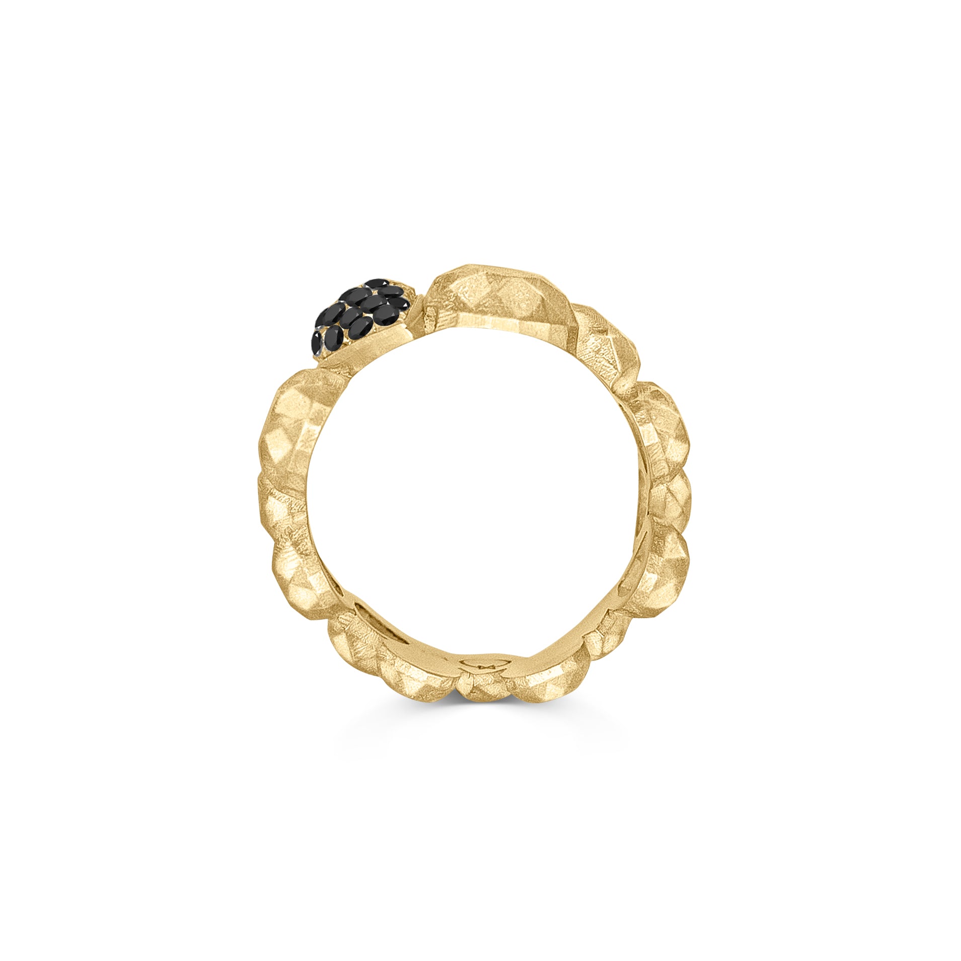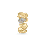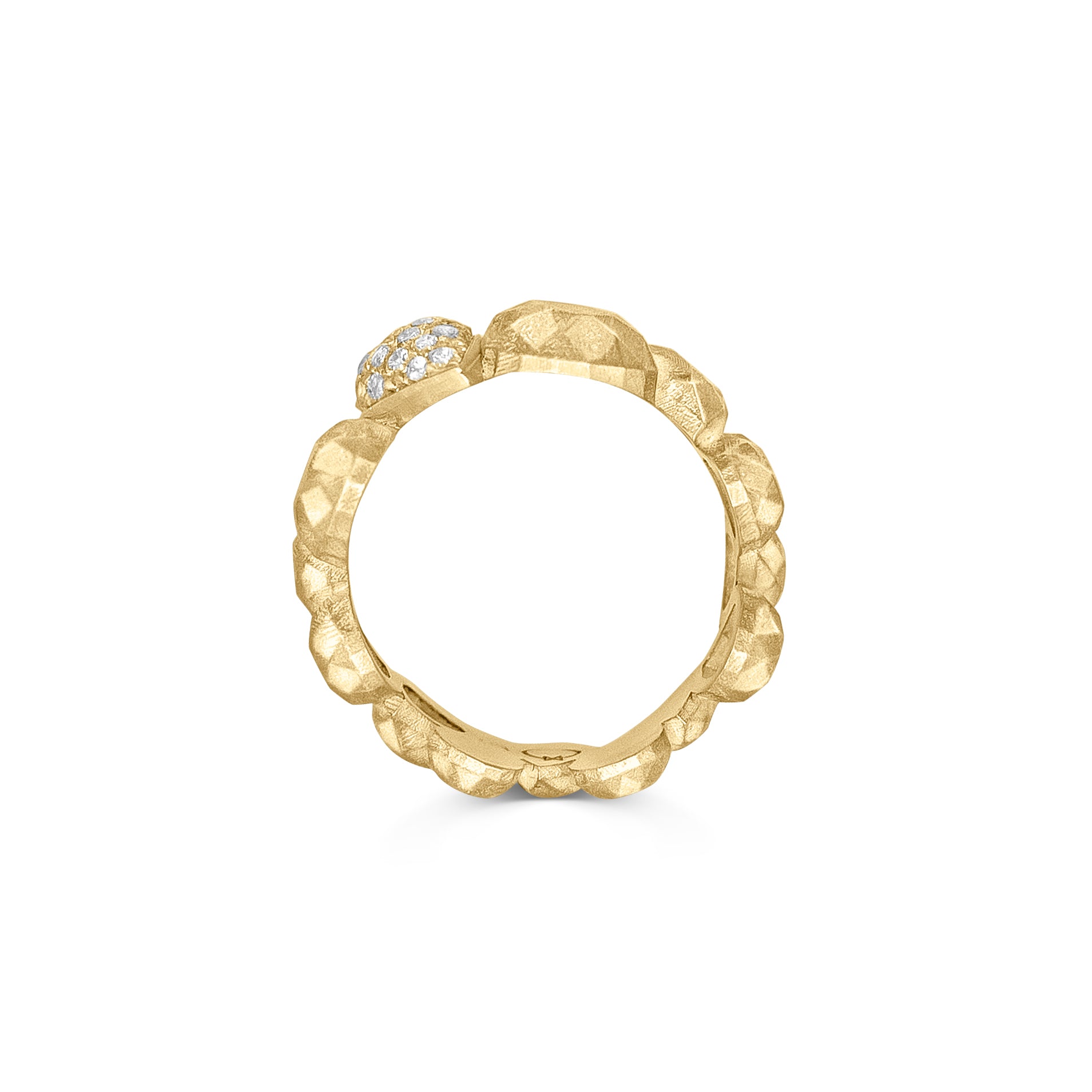 The Pepita Cluster ring is a core piece in Matilde’s Chromo-Fine collection; a charming ‘nugget’ themed piece of jewellery that can be worn as a reminder to seek joy and authenticity in the everyday. Comprised of Matilde’s signature namesake nuggets, it is crafted in warm 14kt gold or recycled silver to create a charming irregular band, then set with a collection of round brilliant-cut white or black diamonds. The ring is also available with a single, brilliant flush-set diamond as an alternative to the full pavé design.